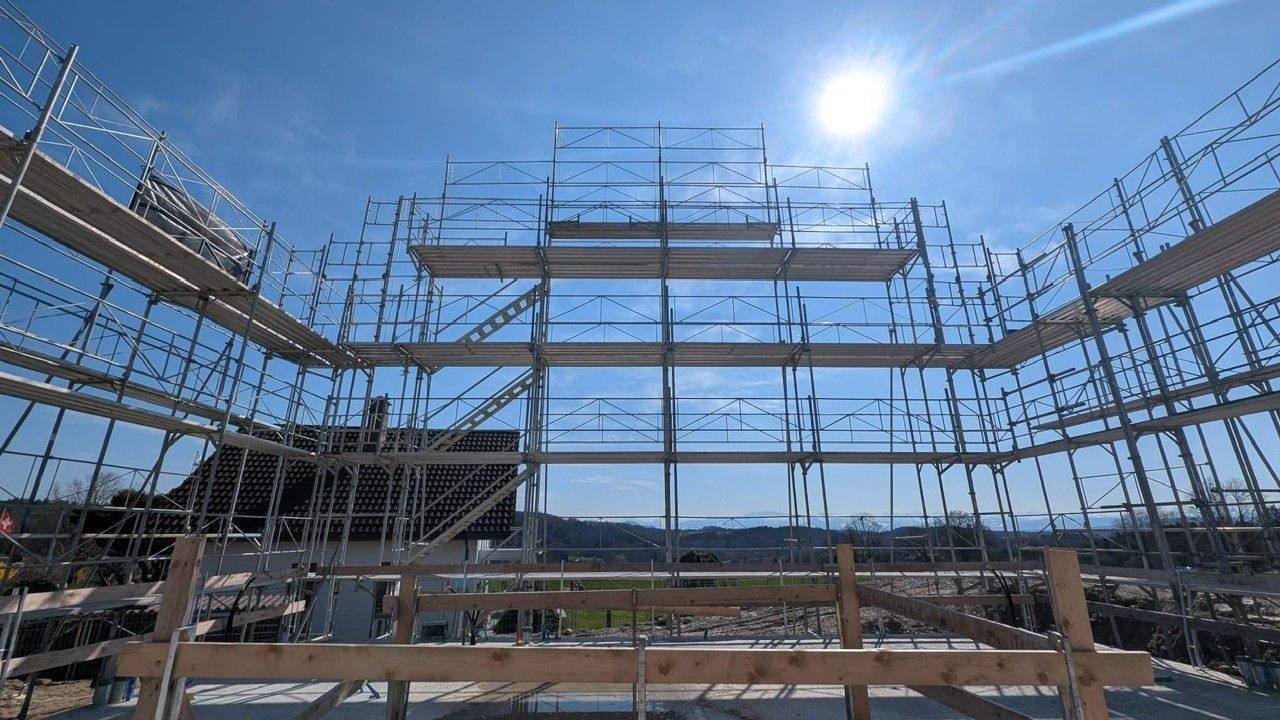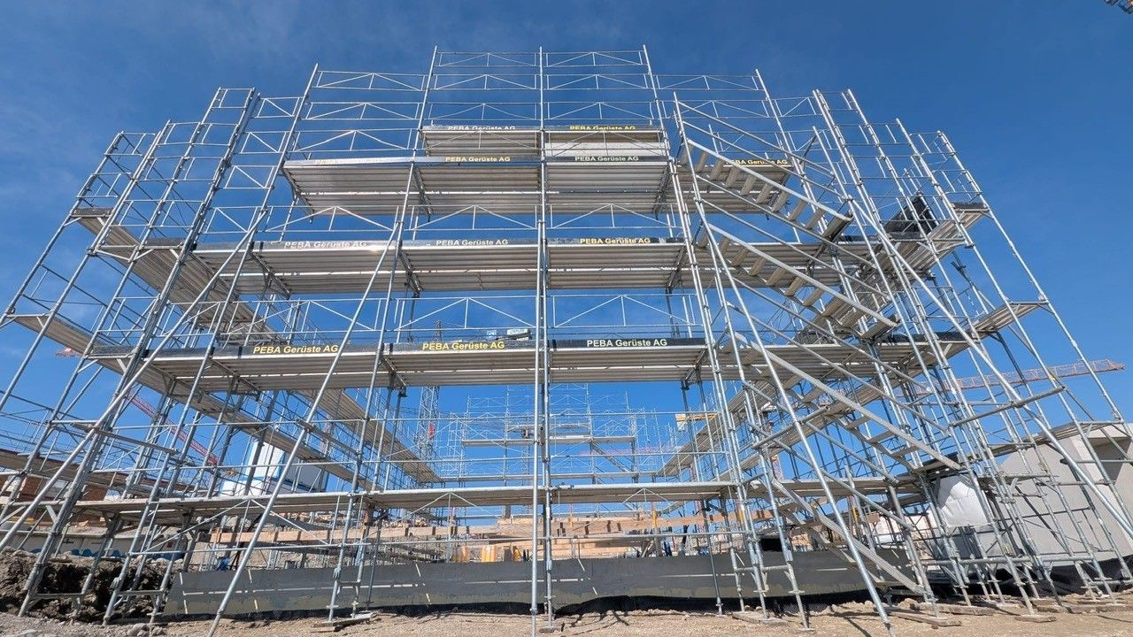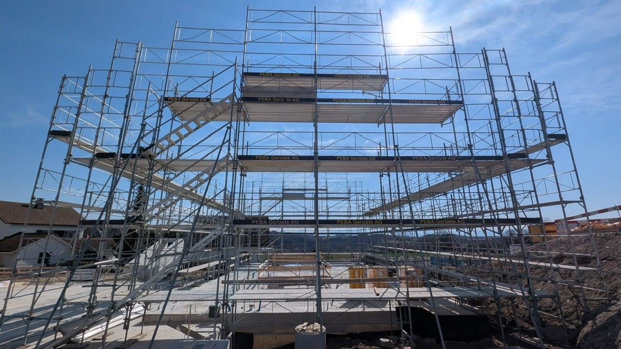 - Auftragsvolumen: 1’800m2 Fassadengerüst, 800 Laufmeter Innengeländer, 1’200m2 Flächengerüst, 8’700m3 Stützgerüst für Flächengerüst, 420 Laufmeter Träger für Flächengerüst